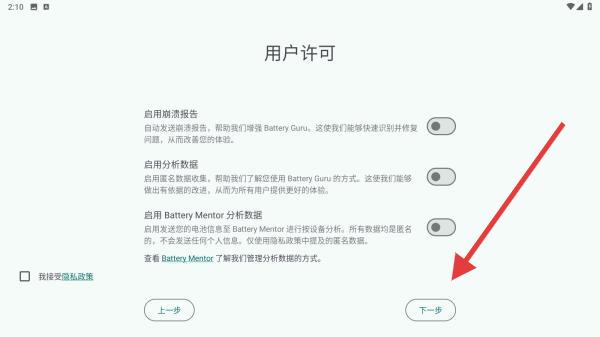 3、用戶許可頁(yè)中,啟用崩潰報(bào)告、啟用分析數(shù)據(jù)、啟用Battery-Mentor分析數(shù)據(jù)可按需開(kāi)啟,點(diǎn)擊下一步完成初始化,若后續(xù)需調(diào)整,可在設(shè)置頁(yè)修改權(quán)限。