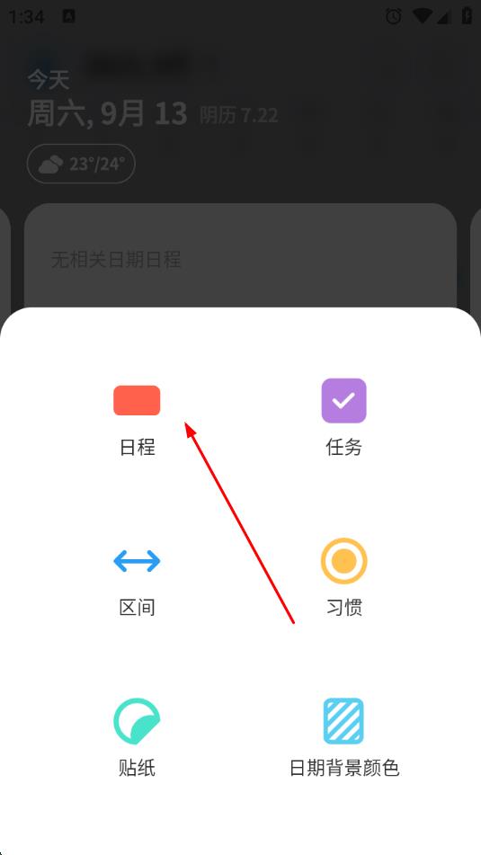 3、點擊+圖標后,會彈出添加事項的選項菜單,點擊日程選項。