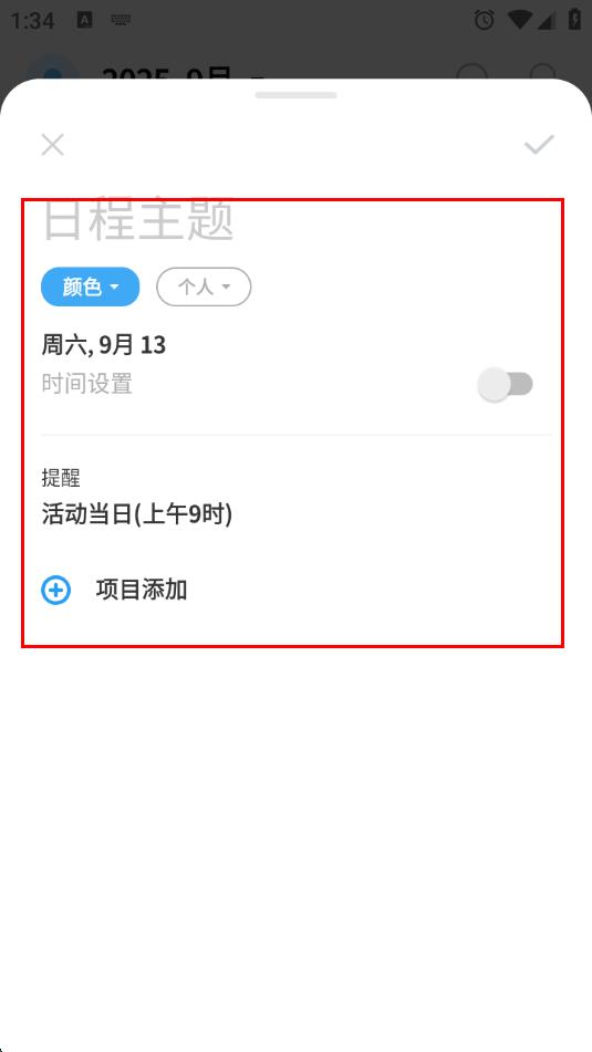 4、進入日程編輯頁面,設(shè)置日程主題、啟時間設(shè)置開關(guān)等,即可完成日程添加。