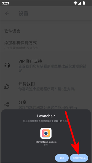3、在彈出的窗口中點(diǎn)擊添加到主屏幕,即可在手機(jī)主屏幕添加魔漫相機(jī)快捷方式。