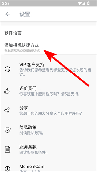 2、在設(shè)置頁(yè)面點(diǎn)擊添加相機(jī)快捷方式選項(xiàng)。