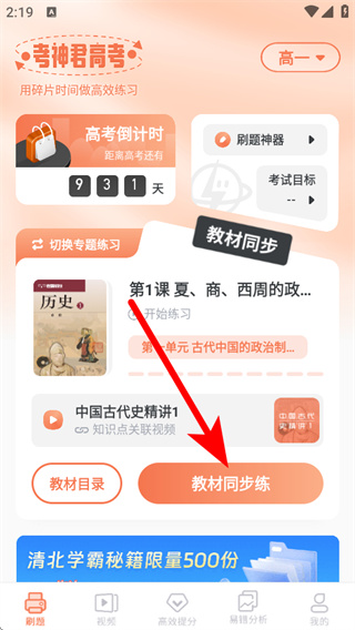 1、打開高中歷史APP,點擊教材同步練,進入教材同步練習頁面。