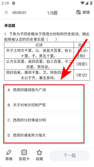 3、在題目界面瀏覽單選題內(nèi)容,分析選項后選擇答案,完成歷史題目練習。
