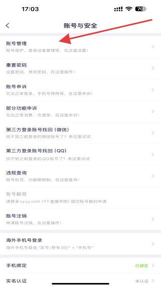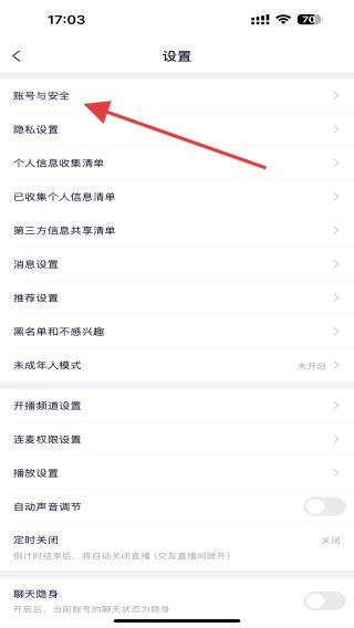 1、打開yy直播APP,在設(shè)置頁面內(nèi)找到并點(diǎn)擊賬號(hào)與安全的功能按鈕。
