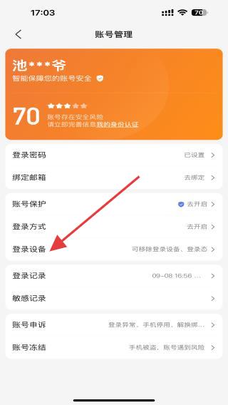 3、在賬號(hào)管理中,向下滑動(dòng)找到并點(diǎn)擊登錄設(shè)備。