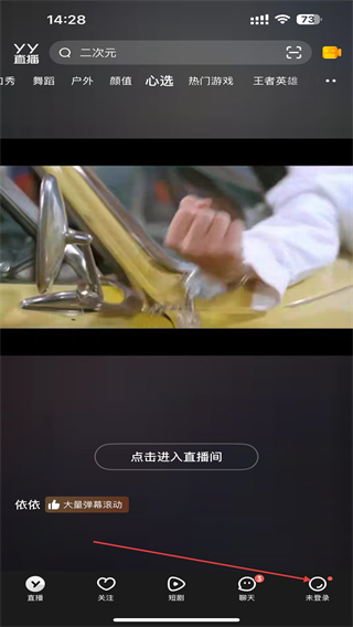 1、啟動(dòng)yy直播間的應(yīng)用,進(jìn)入首頁點(diǎn)擊右下的按鈕。