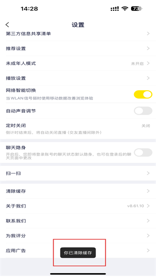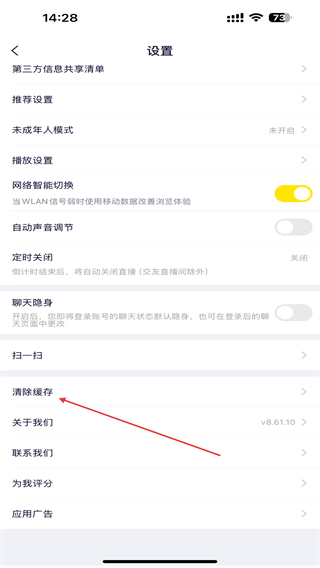 3、在設(shè)置的頁面內(nèi),向下滑動(dòng)點(diǎn)擊清除緩存的按鈕。