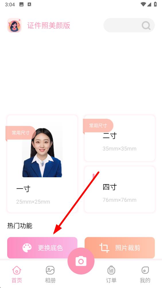 1、打開證件照美顏版應(yīng)用,在首頁熱門功能區(qū)域,點(diǎn)擊更換底色按鈕。