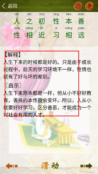 3.兩種學習模式:一種分段朗讀解釋便于孩子家長共同理解學習三字經(jīng);一種全文順序循環(huán)朗讀,逐行跟蹤滾動顯示當前朗讀內(nèi)容,便于孩子跟隨一起詠讀學習。
