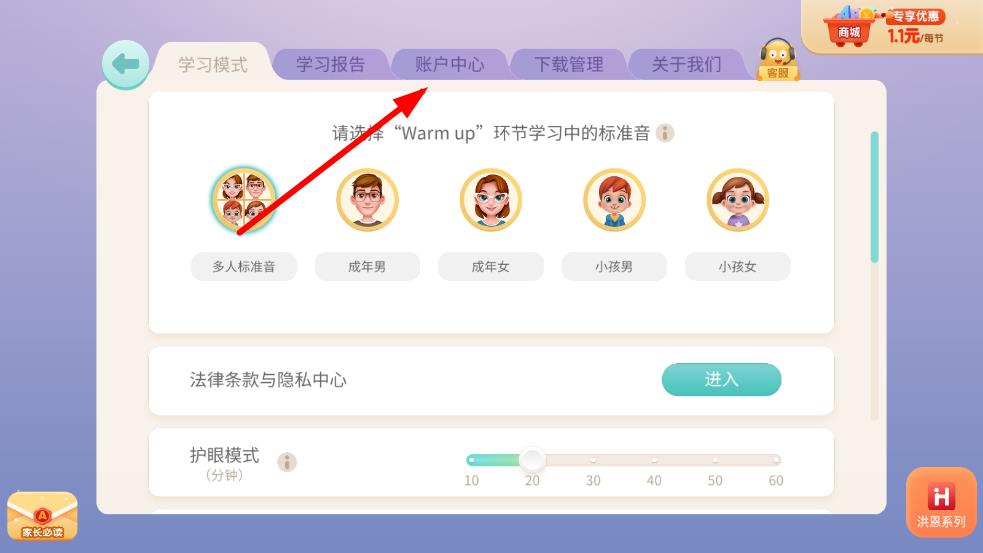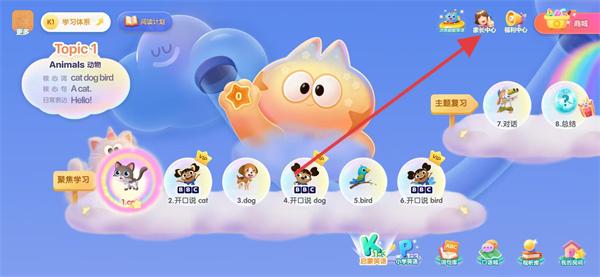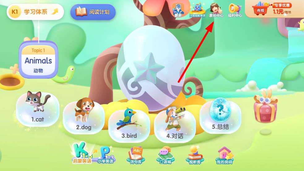 1、打開洪恩英語APP,點擊右上角的家長中心。