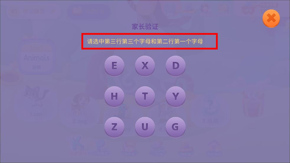 2、在家長驗證界面按照提示選中字母,完成驗證后進入相關(guān)設(shè)置頁面。