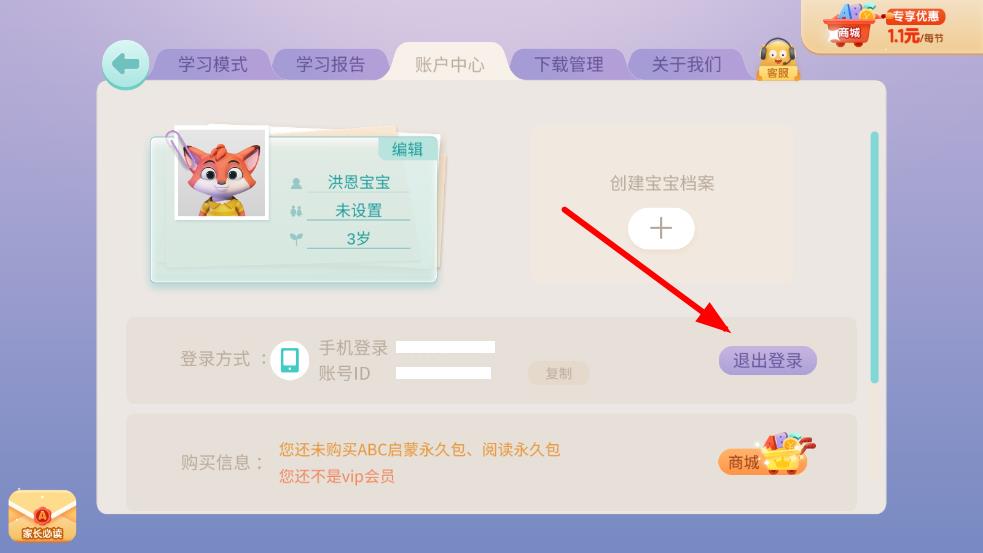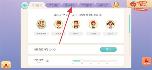 1、打開洪恩ABC應(yīng)用點擊界面上方的家長中心選項,進入家長驗證環(huán)節(jié)。
