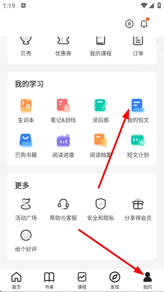 1、打開扇貝閱讀APP,進(jìn)入我的個(gè)人頁(yè)面,點(diǎn)擊我的短文。