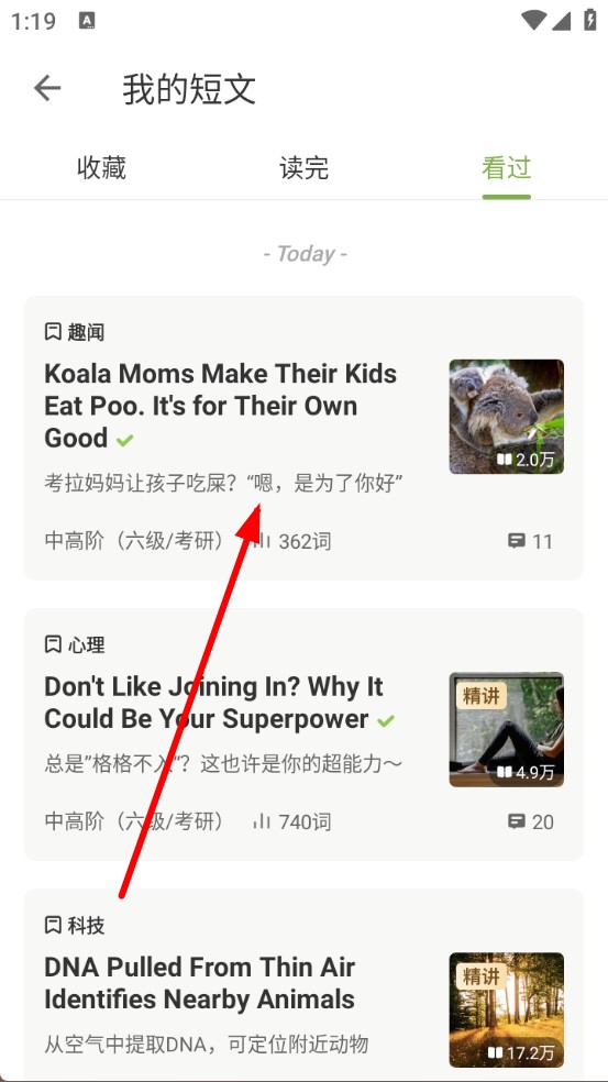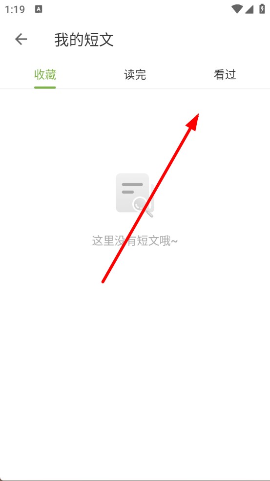 2、進(jìn)入我的短文頁(yè)面后,會(huì)看到收藏、讀完、看過(guò)三個(gè)分類標(biāo)簽,點(diǎn)擊看過(guò)標(biāo)簽。
