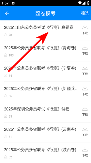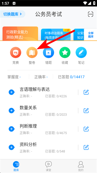 1、在公務(wù)員考試題庫頁面,點擊整卷按鈕,進(jìn)入整卷??嫉捻撁?。