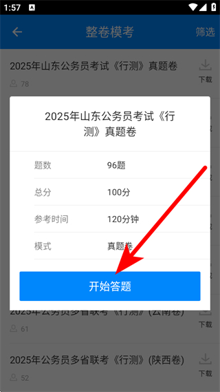 2、在整卷模考的頁面,可以選擇目標(biāo)真題卷,彈出試卷詳情框。