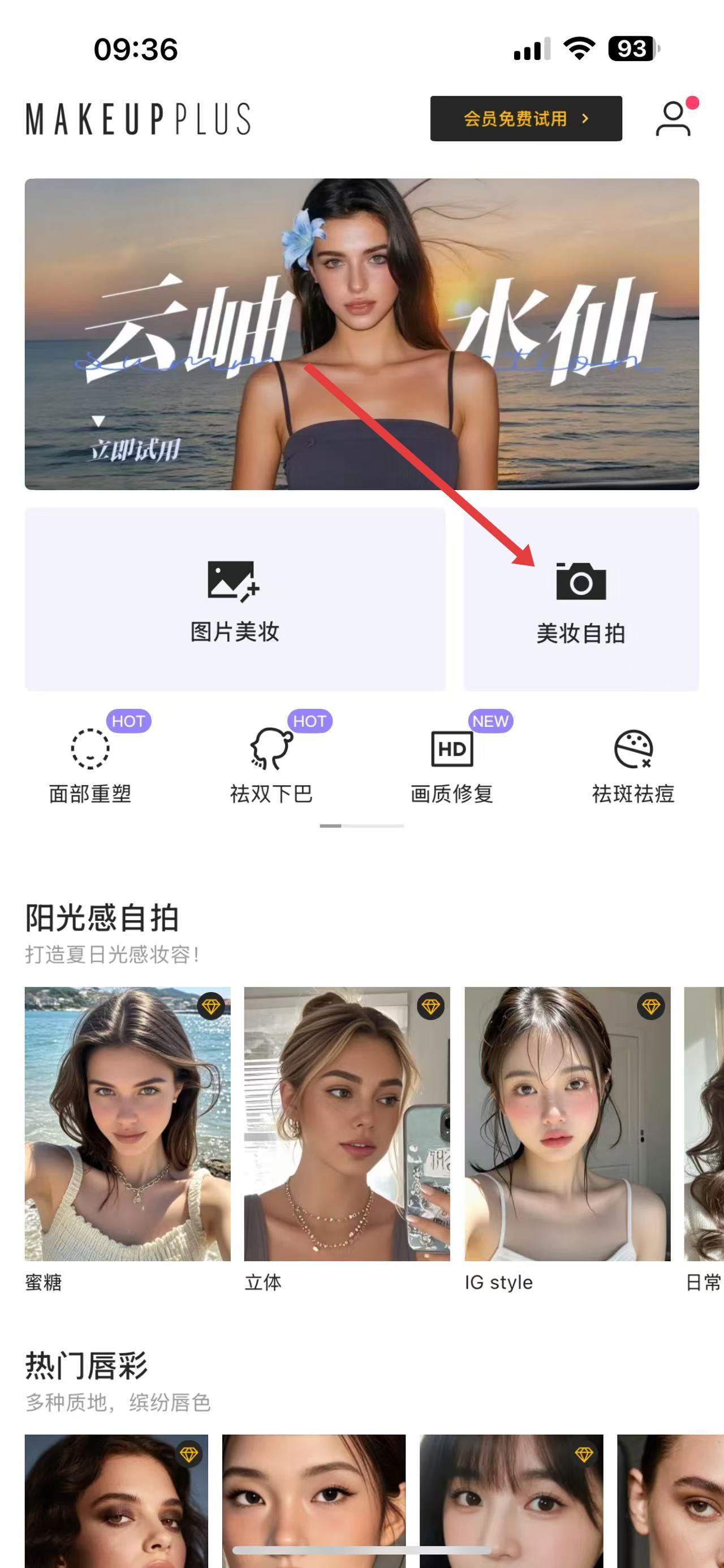 1、打開美妝相機APP,在首頁點擊美妝自拍,進入自拍拍攝界面。