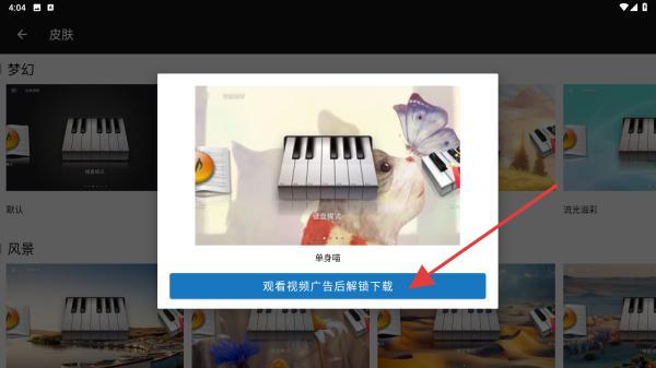 3、若皮膚需觀看廣告解鎖,點擊彈出窗口中的觀看視頻廣告后解鎖下載按鈕,看完廣告后皮膚會自動應用到鋼琴界面。