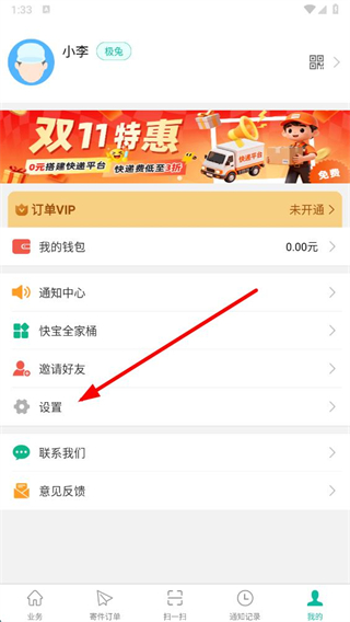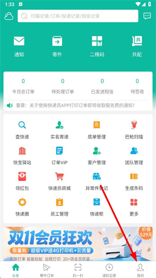 1、在快寶快遞員業(yè)務(wù)頁面,點(diǎn)擊右下角我的進(jìn)入個(gè)人頁面。