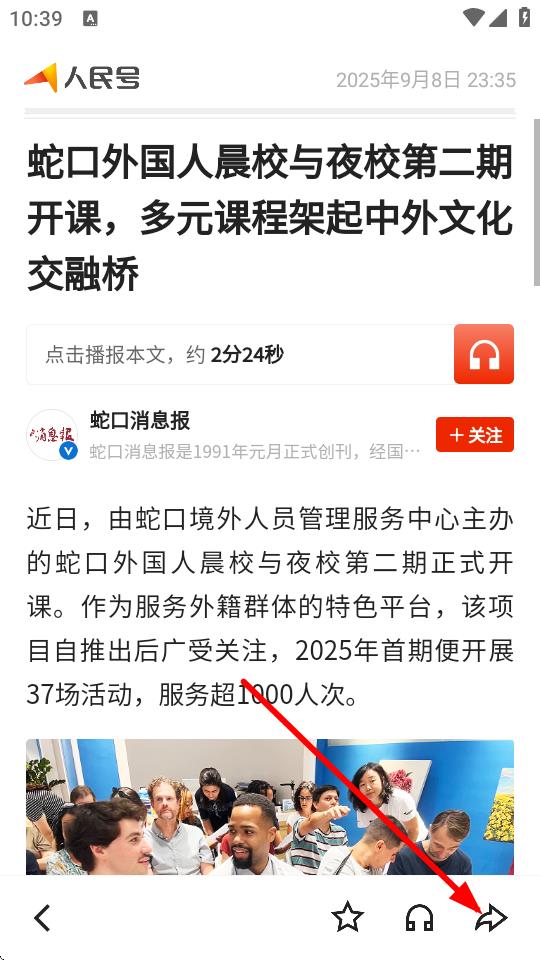 3、進(jìn)入文章詳情頁(yè)后,點(diǎn)擊頁(yè)面右下角的分享圖標(biāo)。