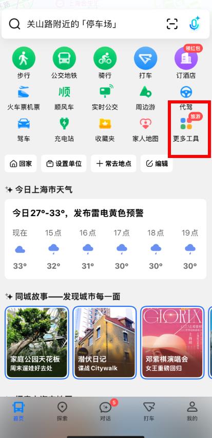 1、打開(kāi)高德地圖APP進(jìn)入首頁(yè),點(diǎn)擊界面右側(cè)更多工具選項(xiàng)進(jìn)入工具列表頁(yè)面。