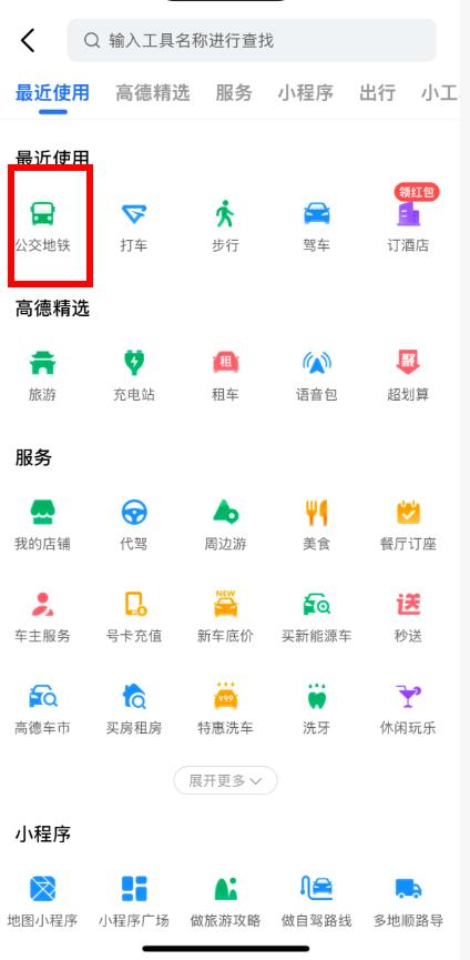 2、在工具列表頁(yè)面的最近使用或其他分類(lèi)中找到并點(diǎn)擊公交地鐵選項(xiàng),進(jìn)入公交地鐵查詢(xún)界面。