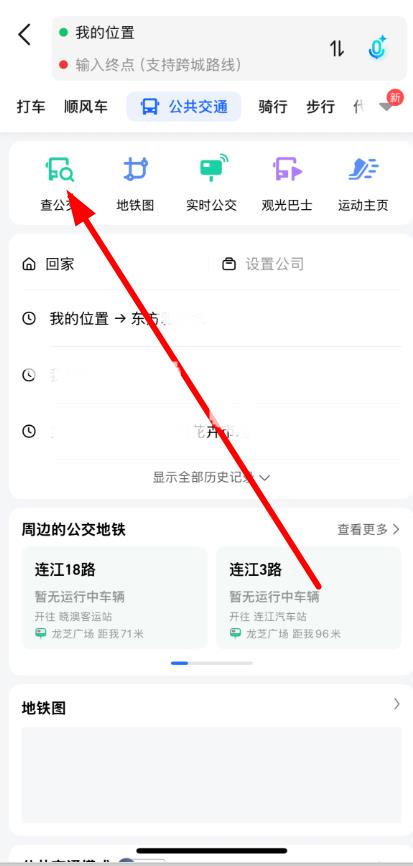 3、在公交地鐵查詢(xún)界面,點(diǎn)擊查公交按鈕,然后輸入起點(diǎn)和終點(diǎn),或者直接查看周邊的公交線(xiàn)路,即可獲取公交車(chē)的線(xiàn)路信息、到站時(shí)間等內(nèi)容。