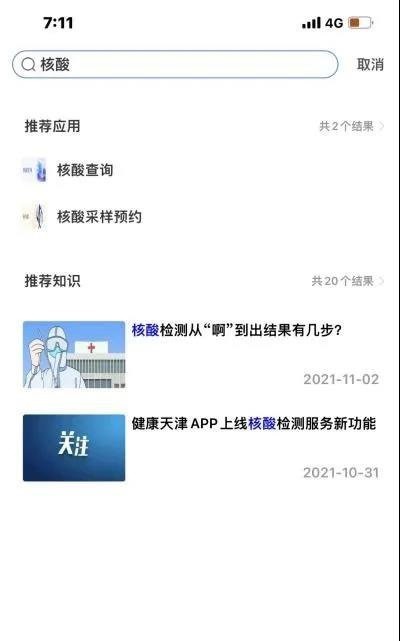 下載并打開“健康天津”App,在首頁上方搜索欄中輸入“核酸”,點擊“核酸查詢”
