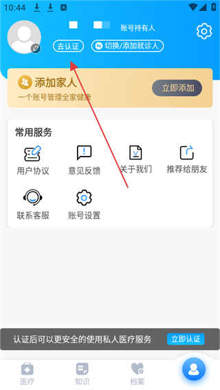 2、在我的頁面中,點擊頭像區(qū)域附近的去認證按鈕。