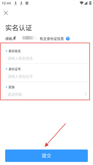 3、在實名認證頁面,輸入姓名、身份證號,選擇民族,點擊提交。