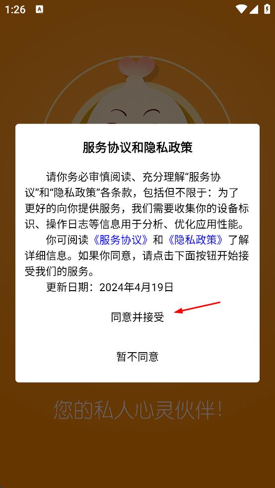 1、打開小冤家APP,在彈出的“服務(wù)協(xié)議和隱私政策”窗口中,點擊“同意并接受”,進(jìn)入APP主界面。