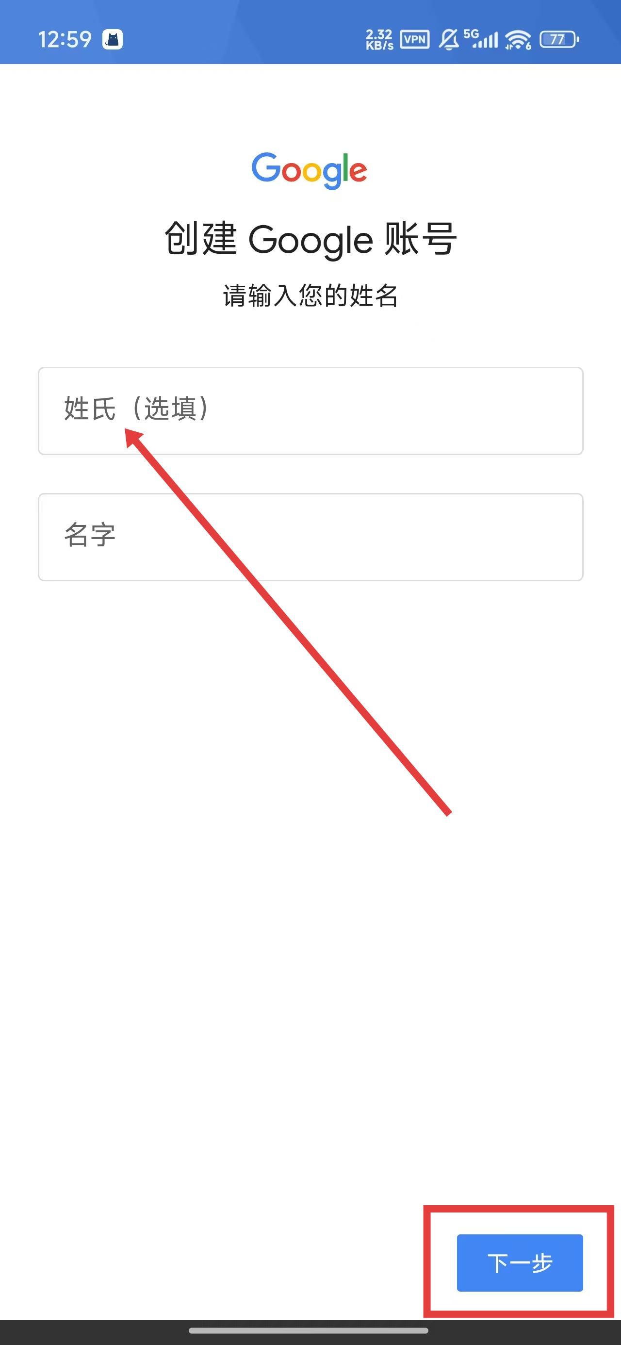 3、進(jìn)入到創(chuàng)建賬號(hào)頁(yè)面時(shí),點(diǎn)擊輸入框依次填寫姓氏和名字后,進(jìn)入下一步操作。