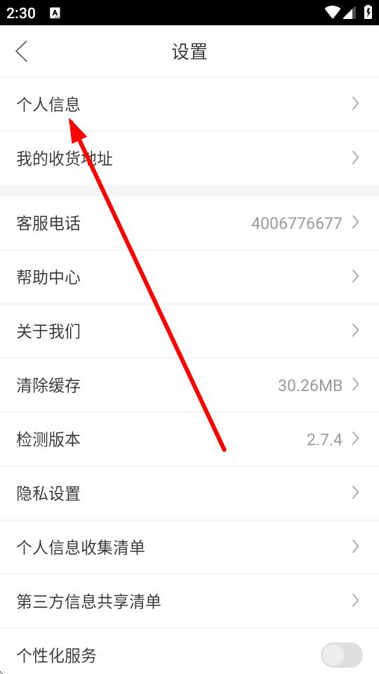 3、在設(shè)置界面,點(diǎn)擊個(gè)人信息選項(xiàng),進(jìn)入個(gè)人信息頁(yè)面。