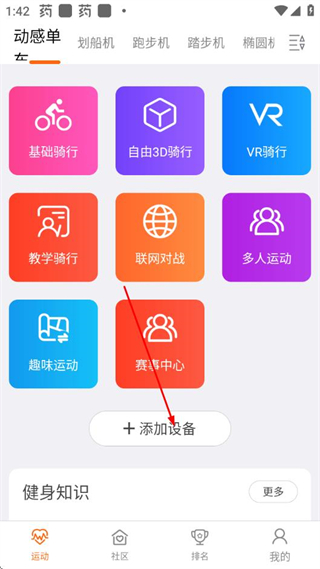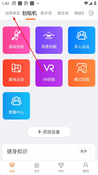 1、打開動騎APP的運動頁面,點擊頂部的動感單車分類,切換至動感單車功能頁。