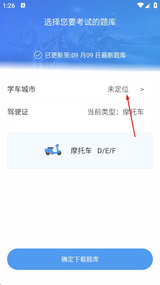 3、選好城市后,返回選擇題庫界面,確認(rèn)駕駛證類型為摩托車,點(diǎn)擊“確定下載題庫”,等待題庫下載完成。