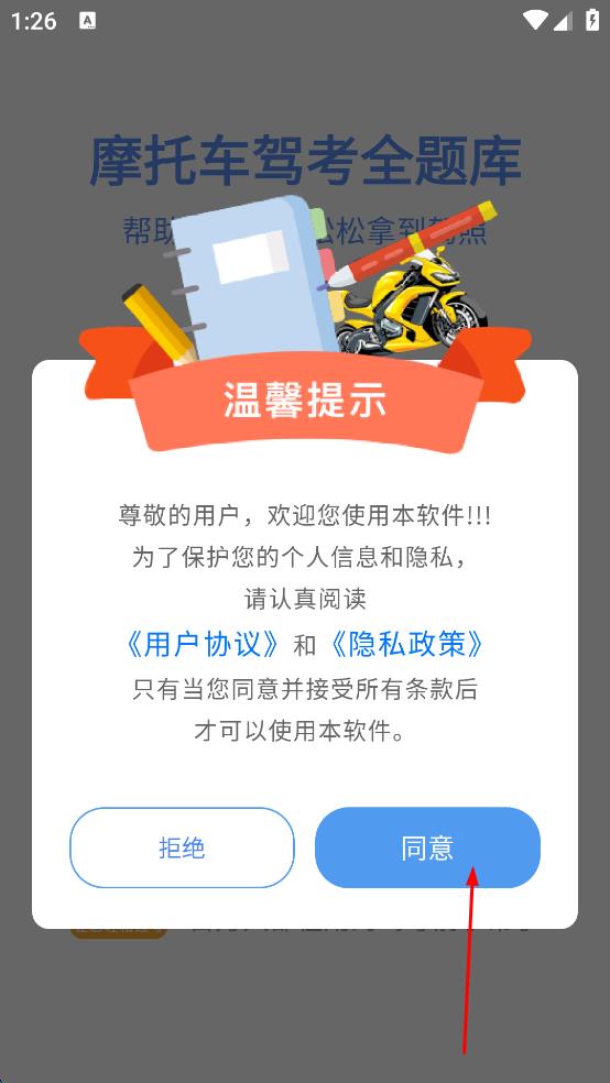1、打開摩托車駕考全題庫APP,在彈出的溫馨提示頁面,點(diǎn)擊“同意”,進(jìn)入選擇題庫界面后,進(jìn)入到下一步驟。