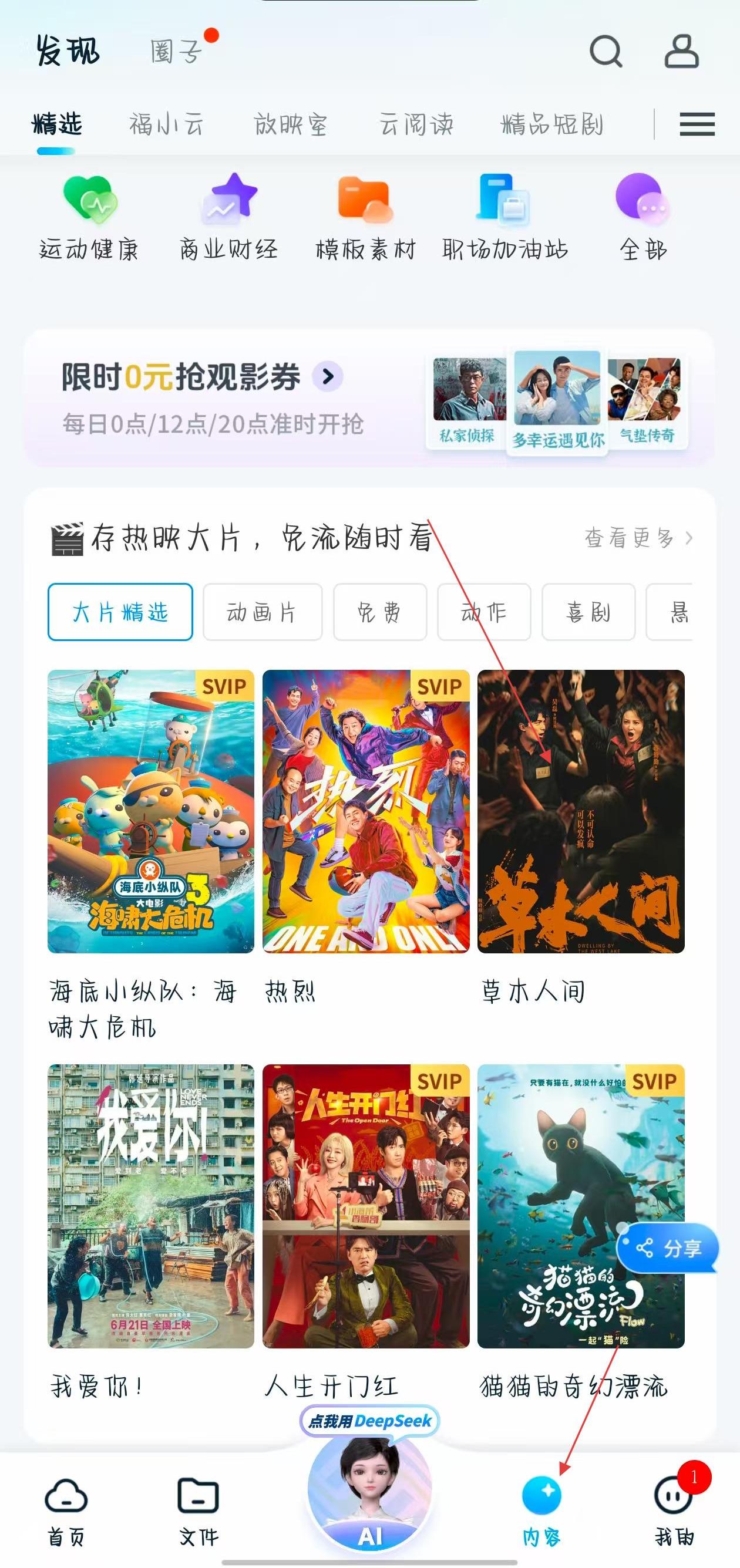 1、開啟中國移動云盤應(yīng)用,點(diǎn)擊底部內(nèi)容進(jìn)入內(nèi)容界面,在界面里找到想存儲的電視劇,如草木人間,點(diǎn)擊封面圖進(jìn)入詳情頁面。