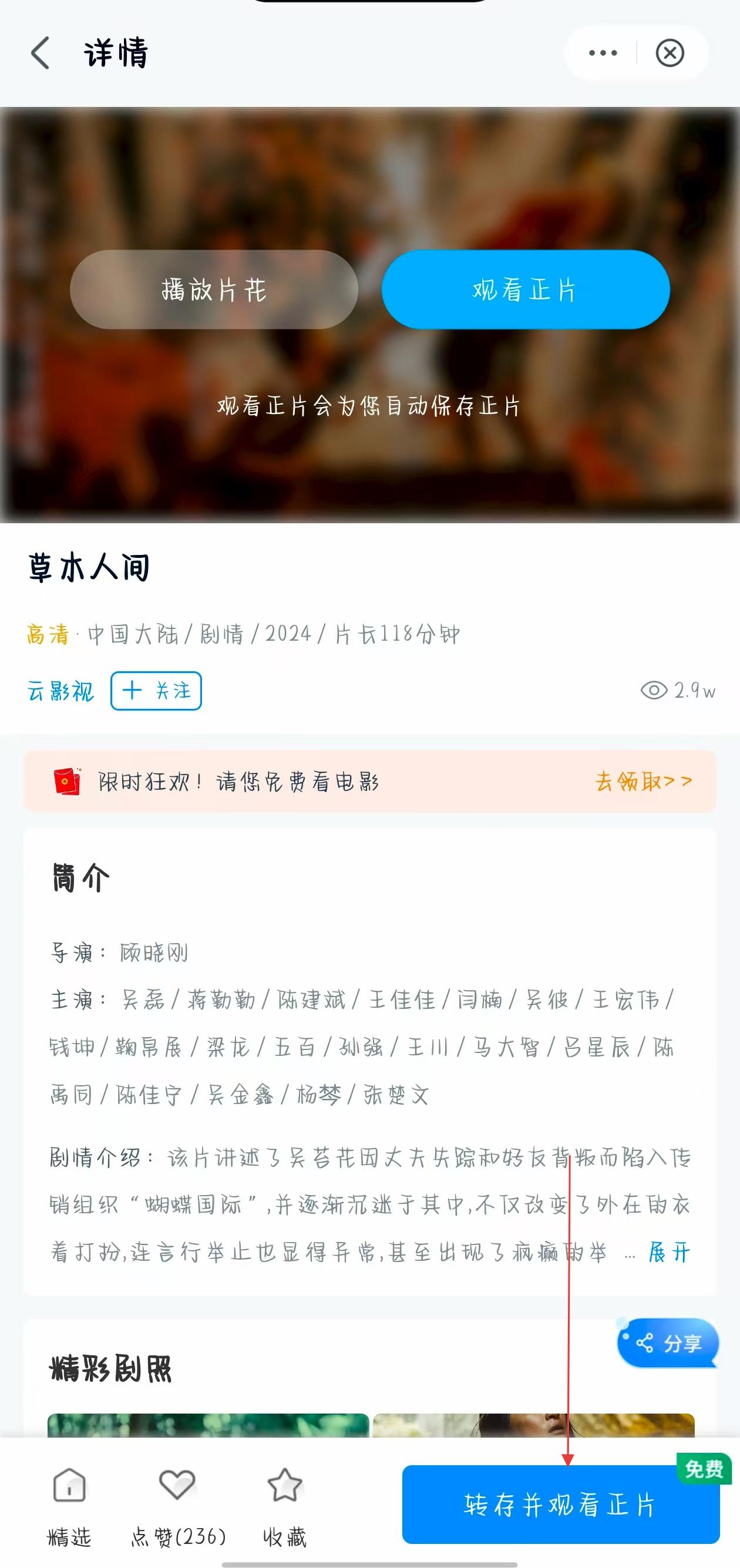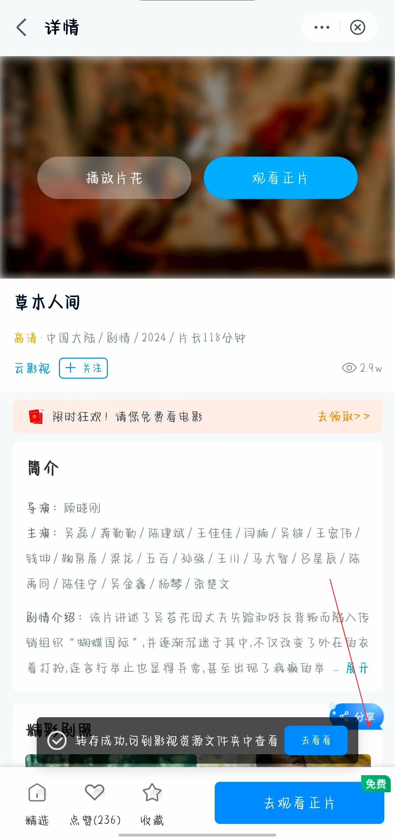 2、在詳情頁面,點(diǎn)擊轉(zhuǎn)存并觀看正片按鈕,部分資源會顯示相似字樣,點(diǎn)擊后等待系統(tǒng)提示轉(zhuǎn)存成功。