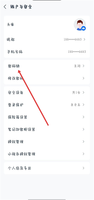 3、在賬戶與安全頁面,點(diǎn)擊密碼鎖選項(xiàng)。