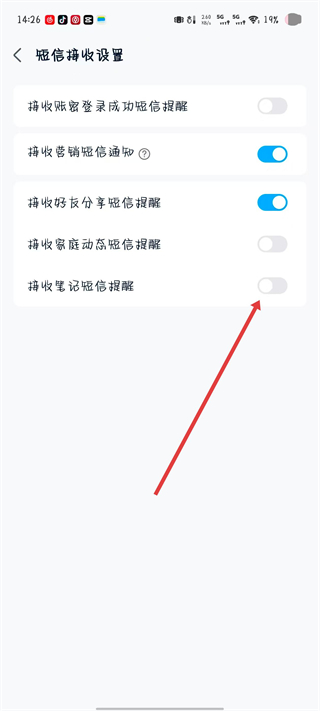 4、點(diǎn)擊接收筆記短信提醒的開關(guān),將其切換為開啟。