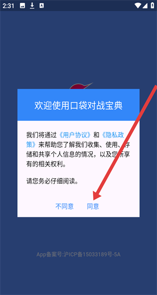 1、點擊“歡迎使用口袋對戰(zhàn)寶典”彈窗的“同意”,進入APP主界面。