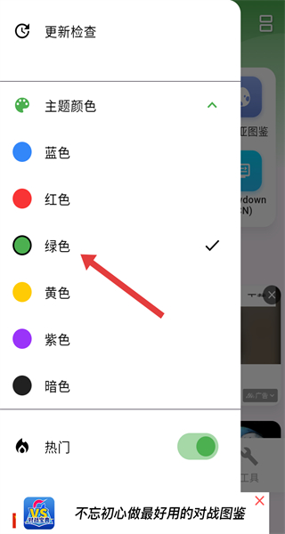 4、顏色選項列表中選擇“綠色”,完成主題顏色設(shè)置。