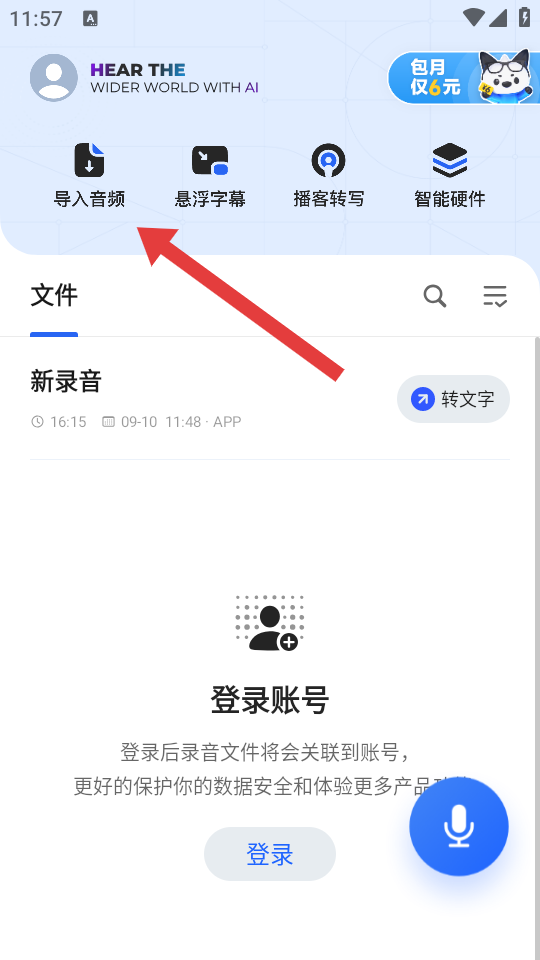 1、在訊飛聽見主界面,點擊上方的導入音頻按鈕,進入文件導入頁面。
