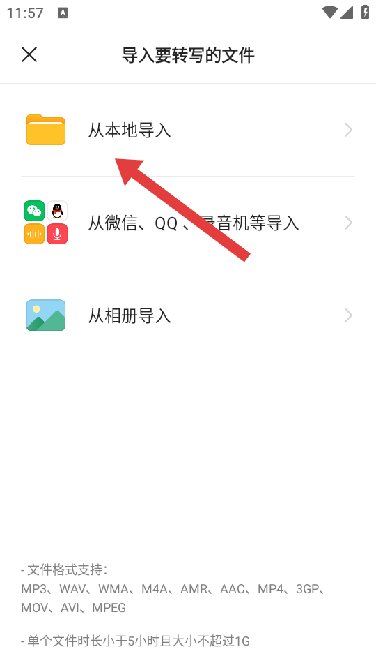 2、在導入要轉(zhuǎn)寫的文件頁面,點擊從本地導入選項,進入本地文件選擇界面。