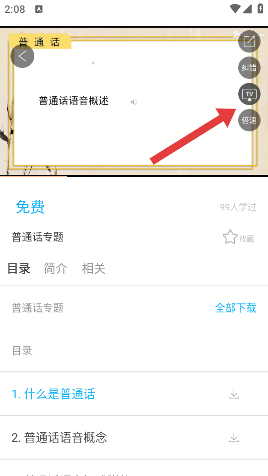 3、在課程播放頁(yè)面,點(diǎn)擊右側(cè)的TV投屏按鈕,進(jìn)入設(shè)備搜索的界面。