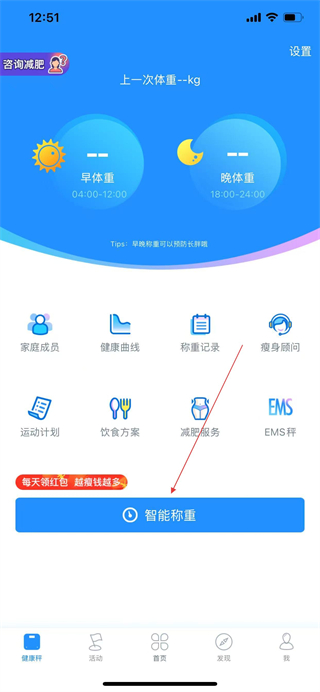 1、在多銳App首頁點(diǎn)擊底部的健康秤選項(xiàng),進(jìn)入健康秤頁面。