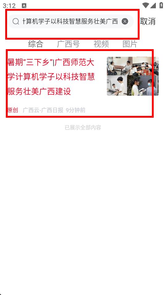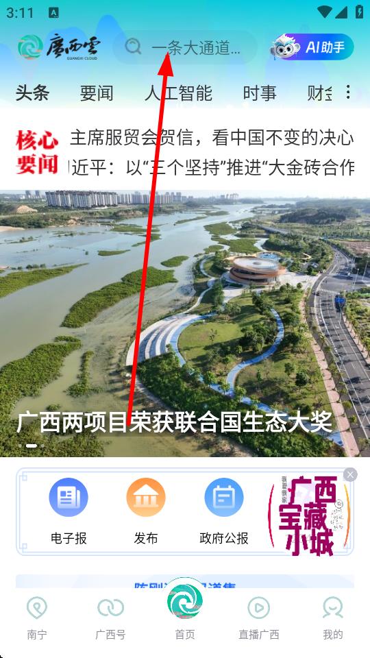 1、打開(kāi)廣西日?qǐng)?bào)app,進(jìn)入主界面,在主界面中找到搜索欄。