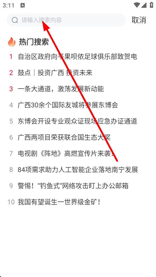 2、點(diǎn)擊搜索欄并輸入想要查找的新聞關(guān)鍵詞。