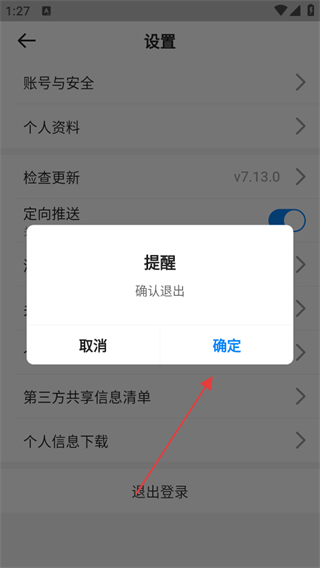 4、在彈出的提醒窗口中,點(diǎn)擊確定,即可退出賬號。