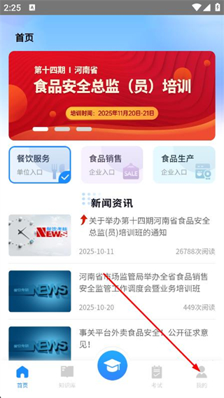 1、打開(kāi)豫食餐飲考核,點(diǎn)擊底部導(dǎo)航欄中我的選項(xiàng)。